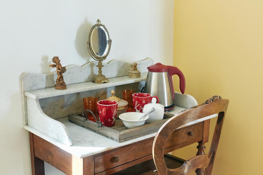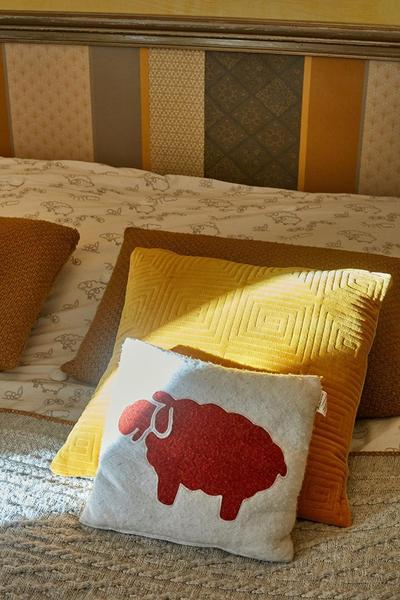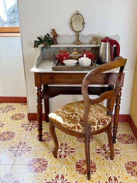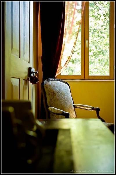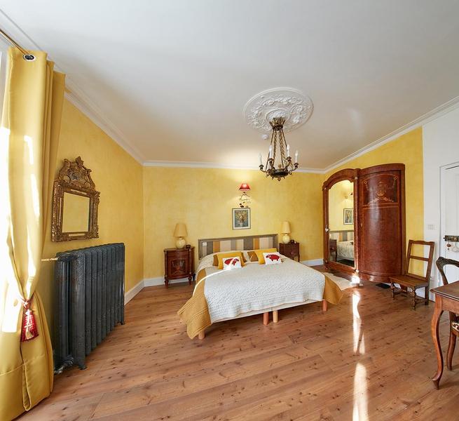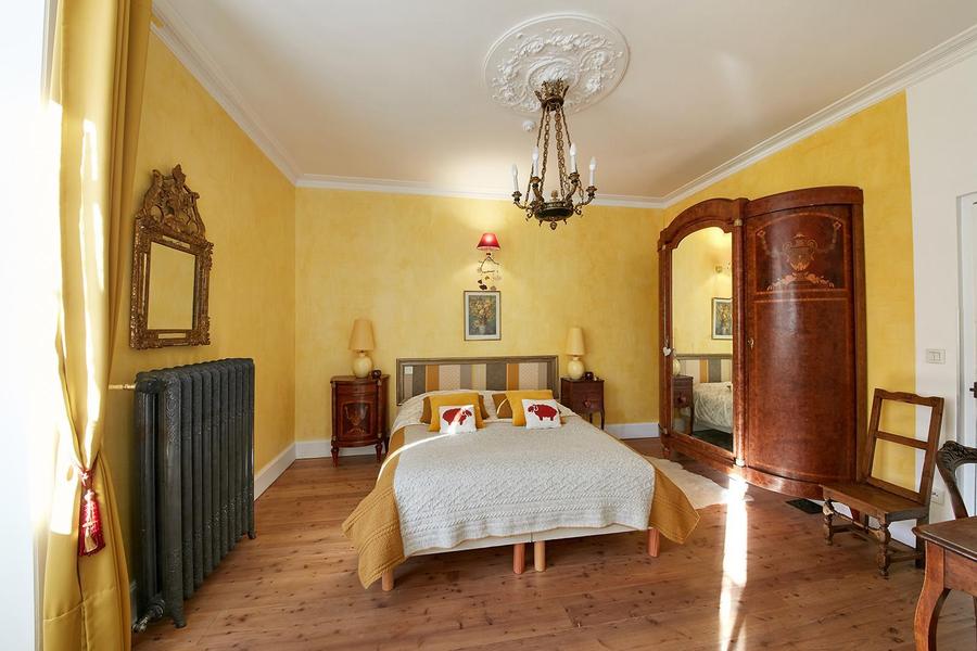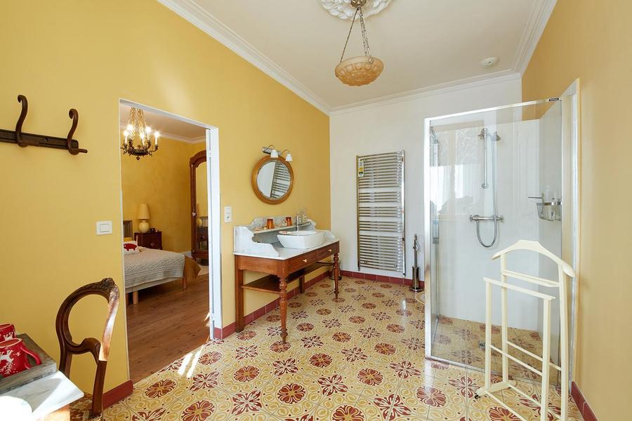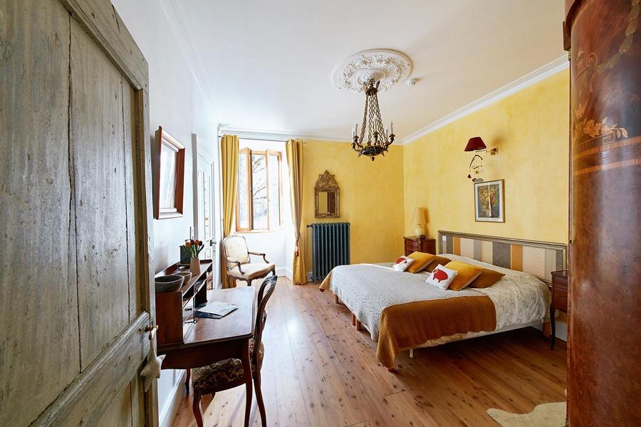 Héliodore "Ardelaine" la chambre couleur soleil dans un style typique de l'âge d'or des moulinages. Dans cette chambre toute la literie est faite en laine de moutons d'Ardèche et fabriquée dans un village voisin. Elle a également sa salle de bains avec douche, WC, lavabo.