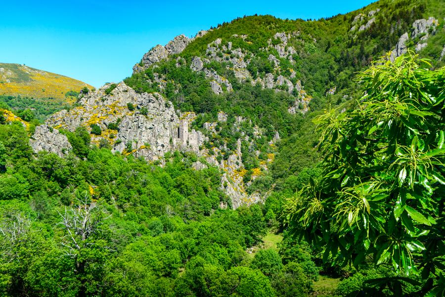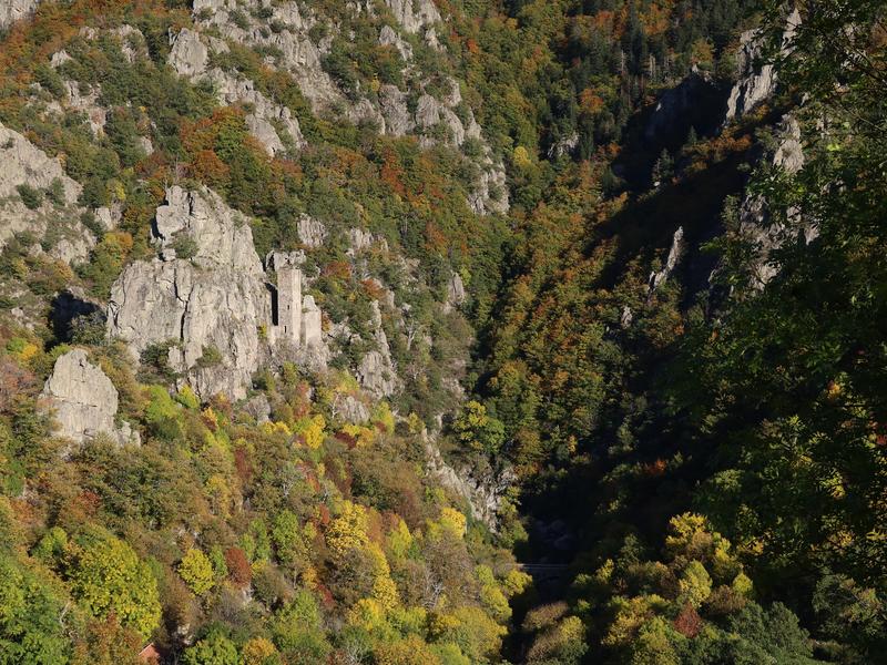Tour impressionnante accrochée à son rocher en dessous du village et au dessus des splendides gorges de la rivière.