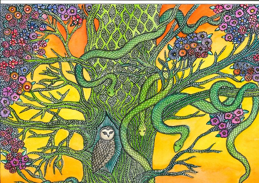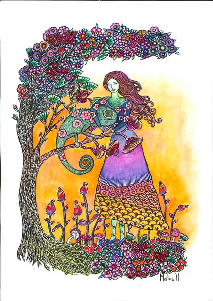 "Illustratrice, je réalise des cartes postales et des affiches de mes aquarelles, retouchées entièrement à l’encre, pour un rendu plus fin et plus précis. J’utilise des couleurs vives et éclatantes créant une atmosphère irréelle. Mon univers est peuplé de femmes-lumières, d’ensorceleuses, d’animaux enchanteurs évoluant dans une nature luxuriante…"