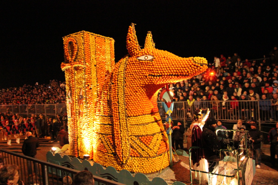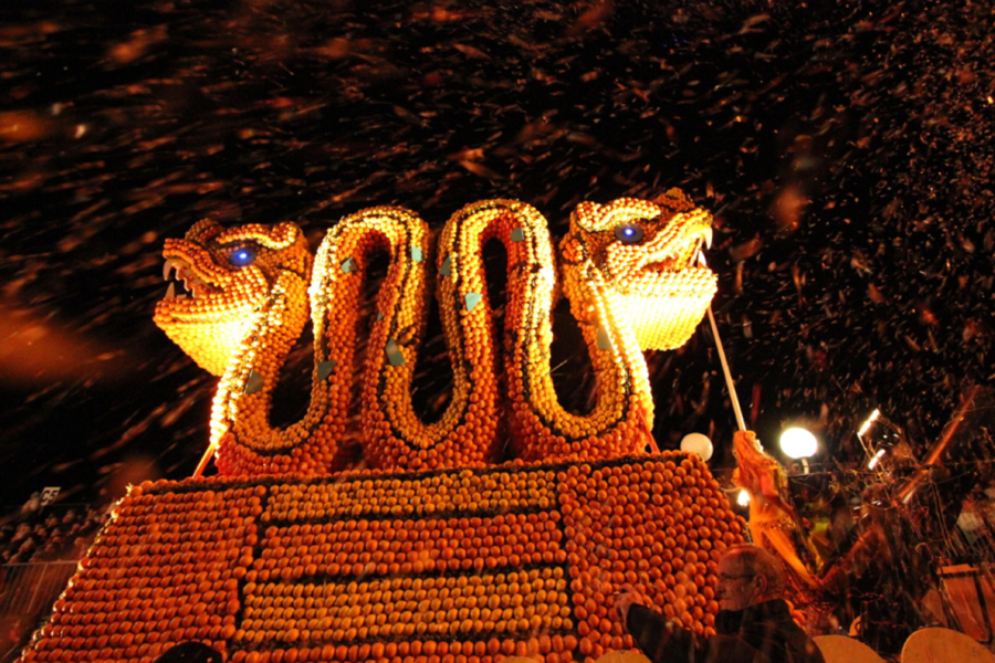 Quand la nuit tombe sur Menton, les corsos nocturnes illuminent la ville d’une douce magie. Sous le scintillement des projecteurs, les chars, parés de citrons et d’oranges, défilent en une symphonie de lumière et de couleurs.