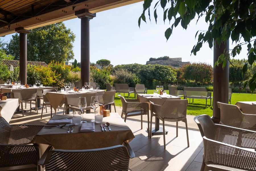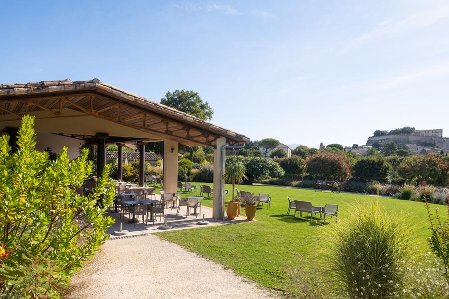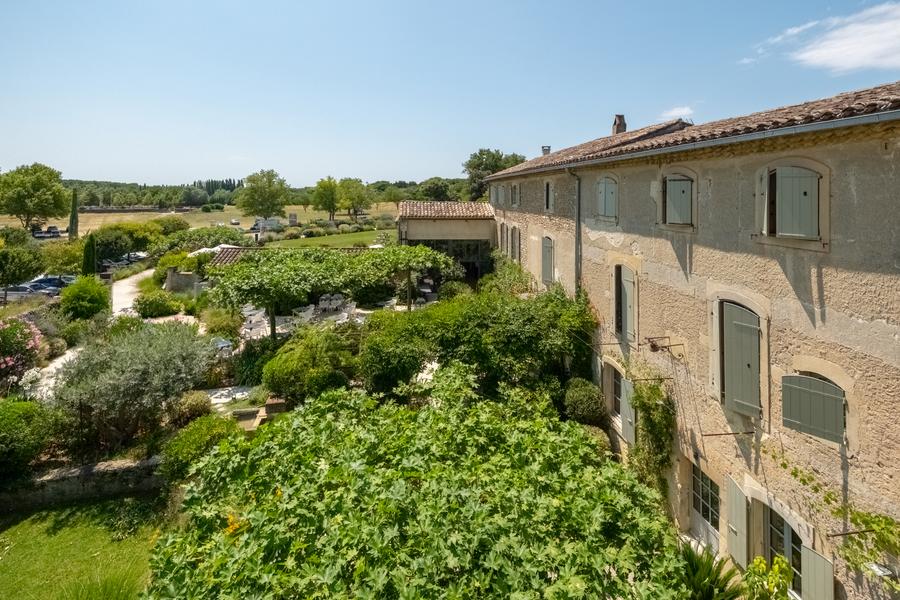 La Ferme Chapouton, premier lieu visible dès l’approche, contemple le village. Entre sols anciens, cheminée et terrasse, le Bistro y a pris place : les plats mijotent, et l’on s’affaire en cuisine. L’enfilade des pièces voutées abritent salons et petit déjeuner buffet au champagne servi dans l’ancienne cuisine. L’authentique escalier conduit aux 13 chambres contemporaines. Derrière la cour, protégée du mistral par l’ancienne maison des sieurs lapins, une piscine chauffée s’est cachée. L’étable des moutons s’est ennoblie : la voilà devenue salles de séminaires, vastes et claires, pour y recevoir jusqu’à 66 hôtes. La véranda avec ses 140 couverts offre une vue imprenable sur le château de Grignan.
