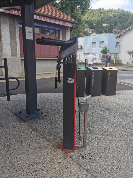 Borne de réparation et de gonflage pour vélos à la gare du Cheylard, à proximité de La Dolce Via.