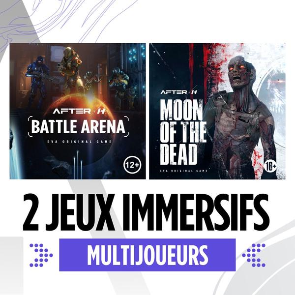L'expérience VR ultime ! Dans une salle de 500m², immergez vous dans un monde virtuel avec 2 jeux : "After-H Battle Arena" (+12 ans) ou "Moon of the Dead" (+16 ans).