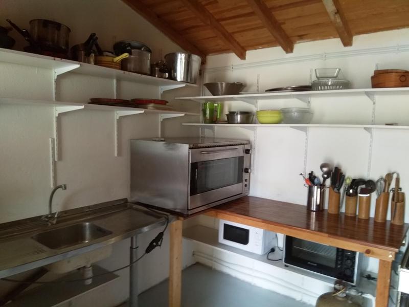 ACCES A NOS 2 POLES CUISINE D’ÉTÉ POLE CUISSON POLE PLONGE ▪ 2 Réfrigérateurs domestiques ▪ 1 Congélateur à pains de glace ▪ 1 Cuisinière à Gaz 5 feux 2 X 9 m2 ▪ 1 Four traditionnel rôtissoire petite taille ▪ 1 Four Micro-onde classique ▪ 1 Grand Four rôtissoire ▪ 1 Four réchauffage gratins et pizzas ▪ 2 Lave-vaisselles ménagers ▪ 2 Eviers et égouttoirs ▪ 1 Percolateur à Café 20 Litres ▪ Bouilloire ▪ Vaisselle et couverts pour 90 personnes ▪ Verres à vins + verres à eaux ▪ Ustensiles de cuisson, plats à gâteaux et à tartes ▪ Essoreuse à salade ▪ Grille-pains dans vos logements respectifs ▪ Autre matériel en prêt, possible ▪ Tables et bancs pour 100 personnes (mobilier amovible)