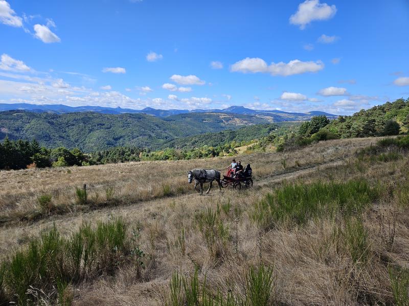 En famille, entre amis ou en amoureux, laissez-vous conduire dans une calèche privatisée. Confortablement installé , en compagnie d’Ingrid, meneuse diplômée, et de Ladie, jument percheronne vous découvrirez nos paysages avec vues sur les monts ardéchois.