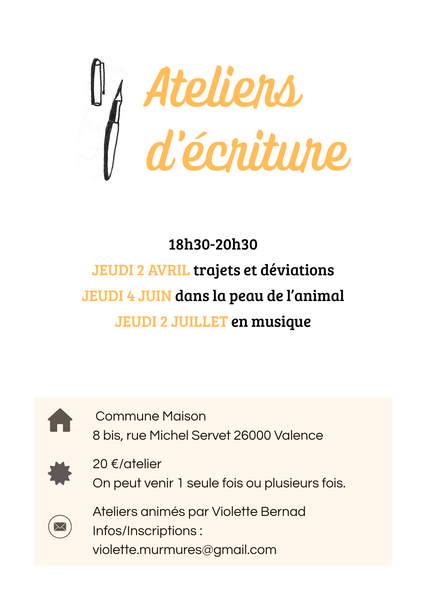 Atelier d'écriture ludique, créatif et bienveillant, pour s'ouvrir à l'écriture et permettre à chacun de jouer avec les mots. En laissant courir son imagination, il sera possible de vaincre la page blanche. Peu importe que vous soyez débutants ou non, vous pouvez venir avec votre crayon ou votre ordinataeur.