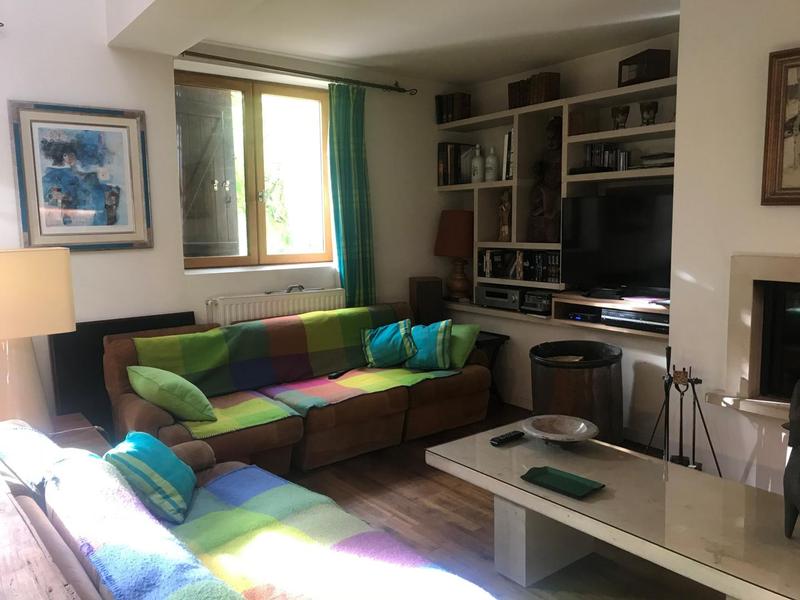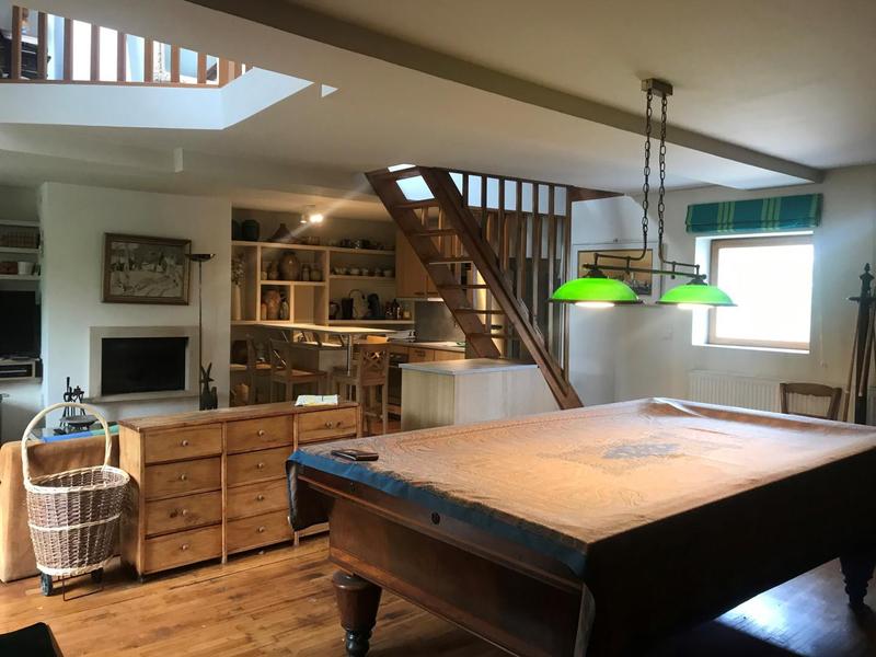Accès par 2 marches à un autre petit salon avec billard, grande bibliothèque, canapés, TV et coin cuisine-bar équipée.